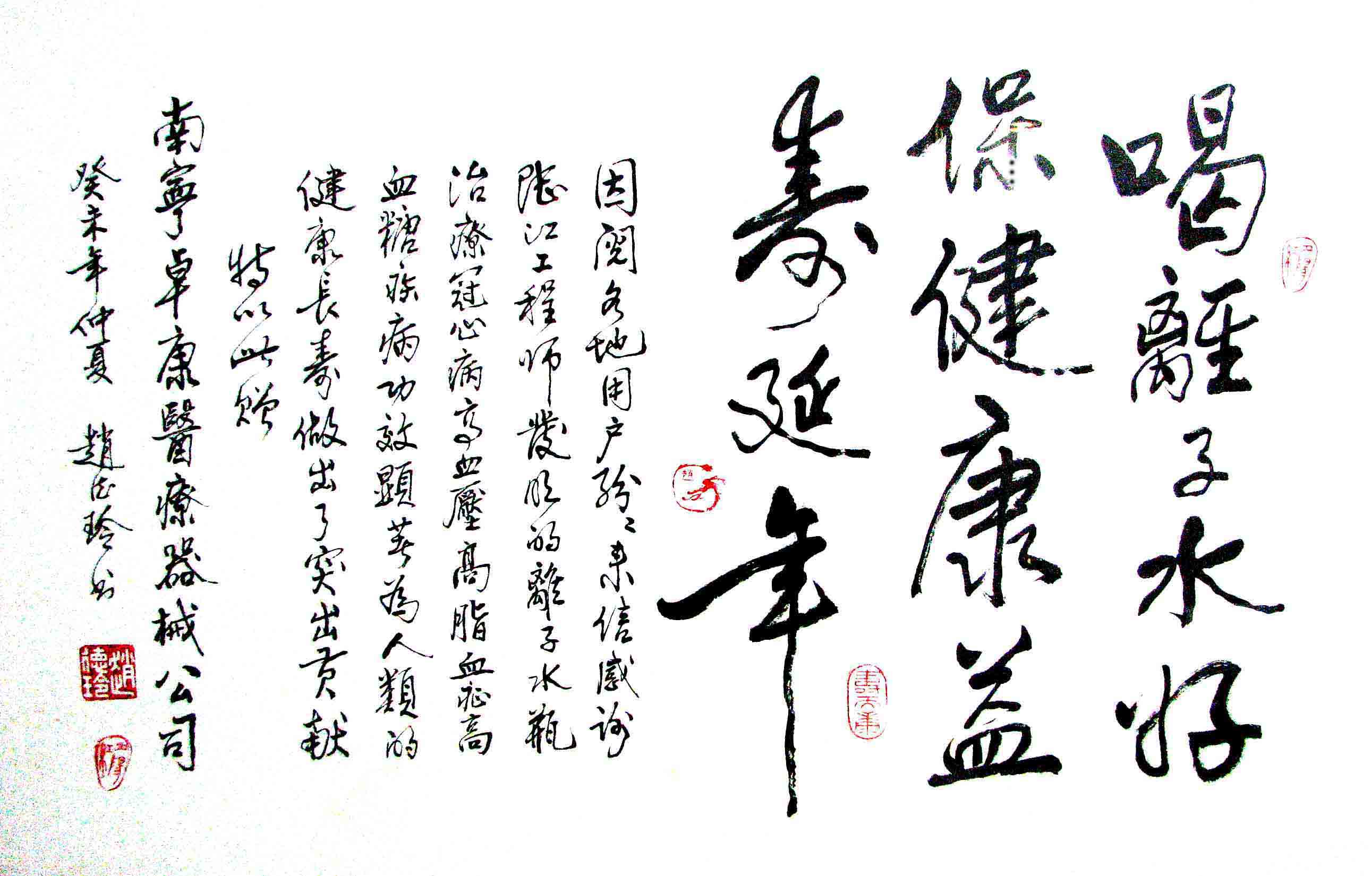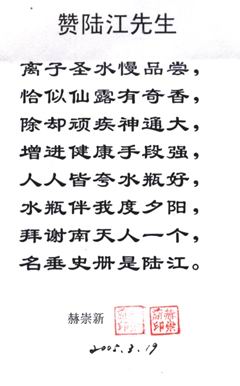 -----我是從事建筑的高工,本來沒有資格去攻克醫(yī)學(xué)難題,卻為了自身健康才扣響醫(yī)學(xué)的大門。由于我1990年患高血壓,因怕中風(fēng)才研究發(fā)明了離子水瓶,我把水處理成微小分子團(tuán)水,飲用后治愈了高血壓。便于1993年底送到三家省級(jí)醫(yī)院做臨床試用4個(gè)月。經(jīng)北京和廣西醫(yī)學(xué)專家鑒定:"降脂降壓效果好"," 能擴(kuò)大心腦動(dòng)脈流量,改善心腦電圖以及微循環(huán)","對(duì)治療心腦動(dòng)脈粥樣硬化、高血壓、高血脂有良好的醫(yī)療保健作用。""產(chǎn)品的技術(shù)性能和療效達(dá)到了同類產(chǎn)品的國內(nèi)領(lǐng)先水平,經(jīng)廣西醫(yī)學(xué)科學(xué)情報(bào)研究所檢索,未見國外有類似報(bào)道。"中國醫(yī)學(xué)科學(xué)院張正國教授從美國國立醫(yī)學(xué)圖書館數(shù)據(jù)庫存Medline檢索英俄文資料,均未見類似報(bào)告。2000年上市后,我為了對(duì)消費(fèi)者負(fù)責(zé)而繼續(xù)觀察研究,一直通過《信譽(yù)卡》和《質(zhì)量跟蹤調(diào)查書》向患者承諾療效,請(qǐng)用戶使用6個(gè)月后反饋效果。和脂壓患者飲用2至5個(gè)月內(nèi),消除癥狀,停服藥物,血壓正常;冠心病患者飲用3~5個(gè)月逐漸減輕至消除心絞痛、房顫等癥狀,不再服藥,飲用1年左右心電圖正常,經(jīng)冠脈造影掃描無明顯狹窄,表明冠心病痊愈。大量患者還反映許多衰弱器官被修復(fù),讓前列腺增生、慢性咽喉炎、慢性氣管炎、支氣管炎、慢性胃炎、腸炎和膽囊炎等不藥而愈;2型糖尿病患者是因?yàn)橐葝u衰弱致病,飲用該水半年至一年,逐漸減藥至停藥,血糖尿糖正常,真正治愈2型糖尿病。中風(fēng)后遺癥患者飲用六七個(gè)月,可逐漸減輕至消除肢體和語言障礙,表明飲用該水能讓壽命很長(zhǎng)的神經(jīng)元細(xì)胞逐漸修復(fù),奇跡般地恢復(fù)肢體和語言功能。飲用后還使胸腺和脾臟兩個(gè)重要的免疫器官被修復(fù)和增強(qiáng),產(chǎn)生免疫細(xì)胞多,提高了免疫力,使人不生病或少生病。自此, 飲用微小分子團(tuán)水創(chuàng)造了攻克冠心病、高(低)血壓和糖尿病三大醫(yī)學(xué)難題的奇跡。人們對(duì)此感到不可思議,但實(shí)踐是檢驗(yàn)真理的唯一標(biāo)準(zhǔn)。